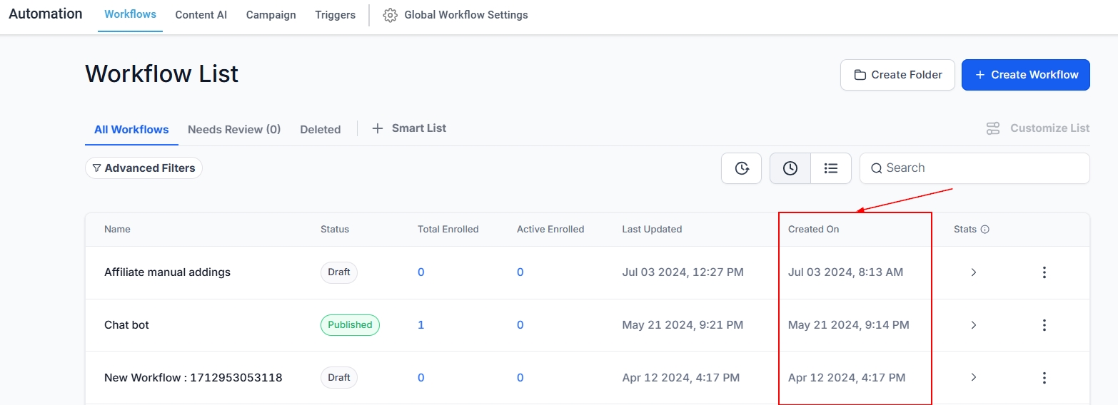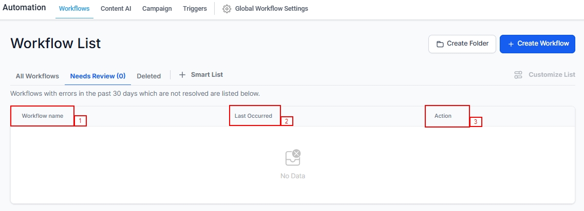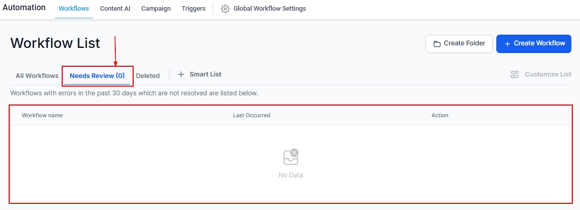 To begin a new workflow, click the +Create Workflow button. This initiates the workflow creation process, allowing you to set up automated actions.