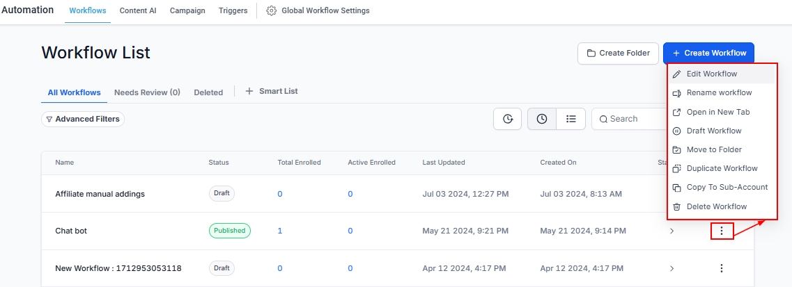 The three dots Action menu gives you action items for your workflows including editing, opening the workflow in a new tab, moving to a folder, duplicating, and deleting.