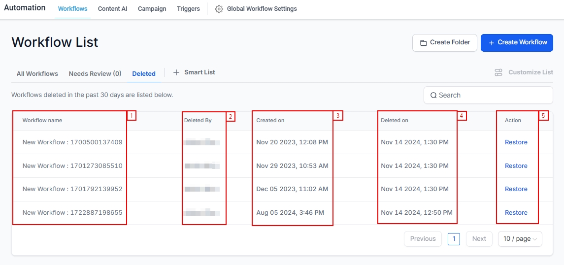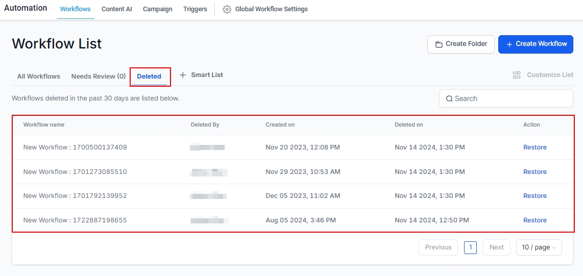 Within this section, you can view and restore workflows that have been deleted within the past 30 days.