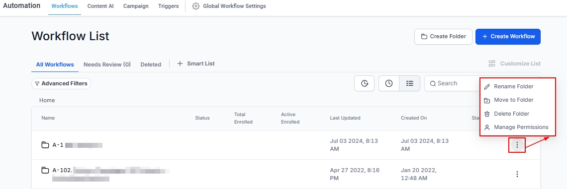 Rename Folder allows you to change the name of a workflow folder. Just click the three dots next to the folder you wish to rename.