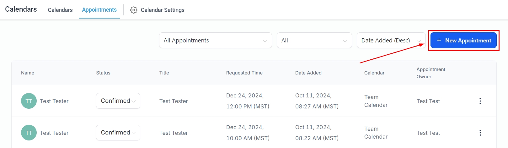 You can manually schedule appointments in your CRM by going to the Calendars tab, clicking on Appointments at the top of the page, and then clicking the "+ New Appointment" button on the top left.