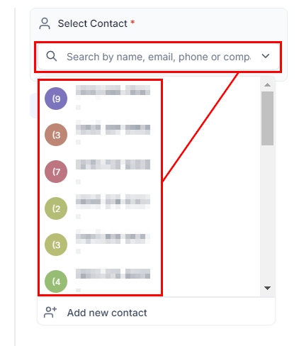 You can search for contacts using their names, Email, phone numbers, or company. You can also click on the search bar to drop down the contact options.