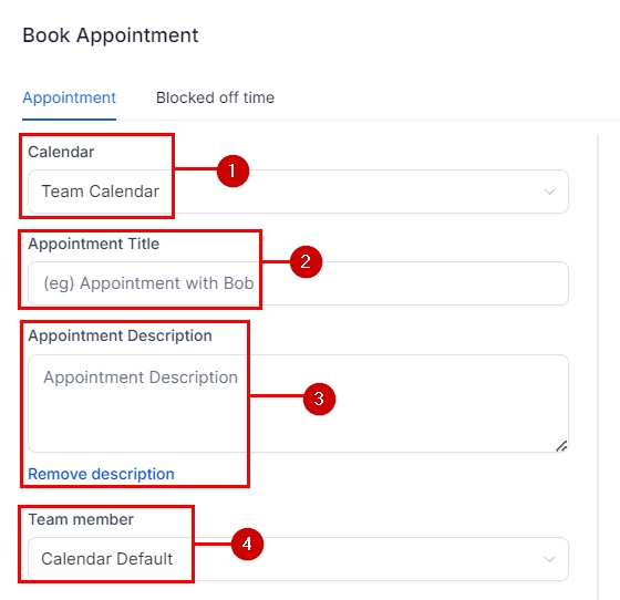 Click the "Add Description" button to access the Appointment Description box. This field allows you or your team to note details referring to the meeting while booking and will be visible to the contact