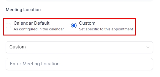 You can select between Calendar Default (the location established in the specific calendar you chose) or set a custom meeting location to change the location at will. Please remember, if this field is left empty the system will fill it with your business address instead.