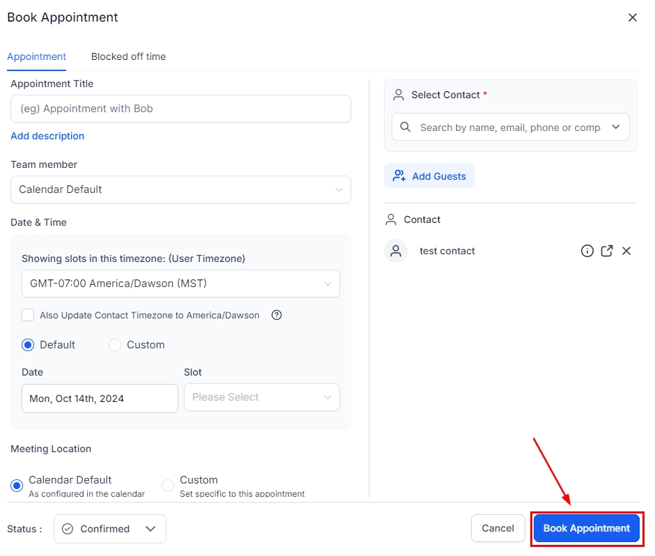 Doing so will trigger any workflows you've set up related to the calendar and notify the contact of their appointment. The appointment will be added to the owner's calendar as well.