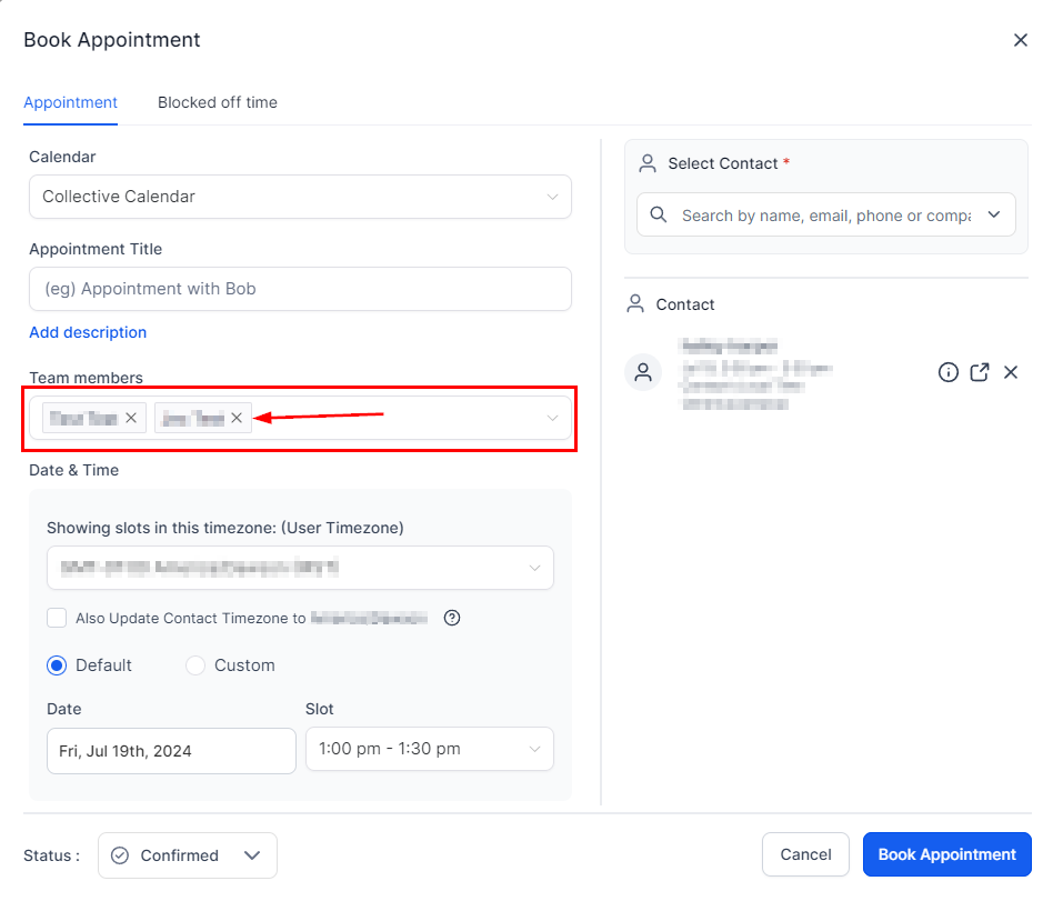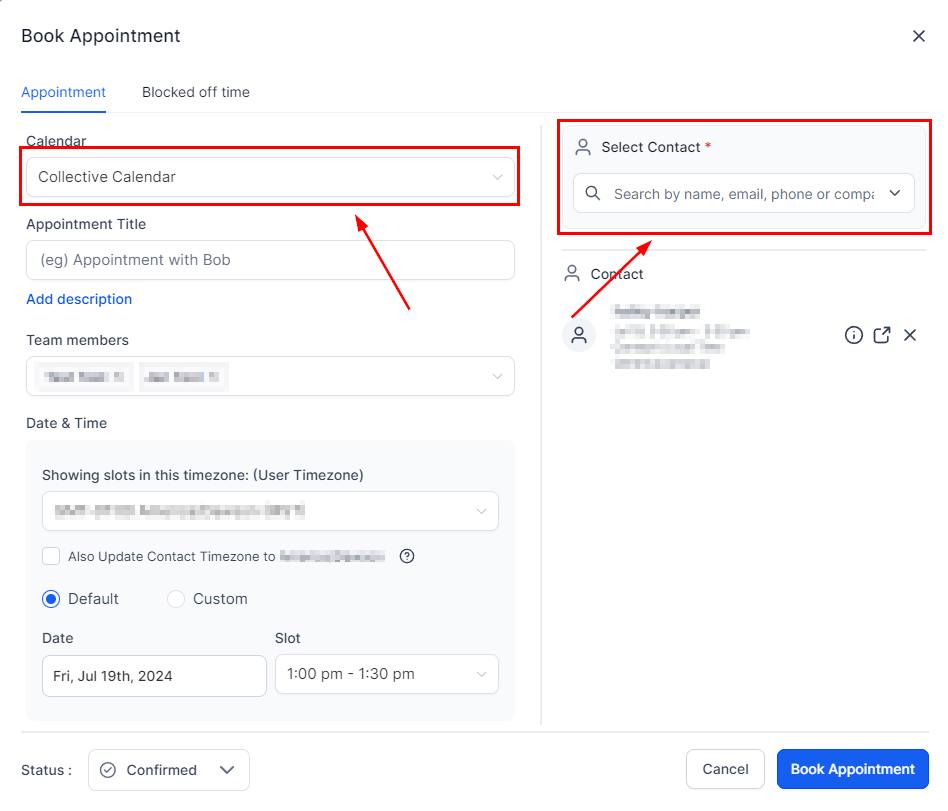 Select the desired Collective Booking calendar and contact for the appointment.