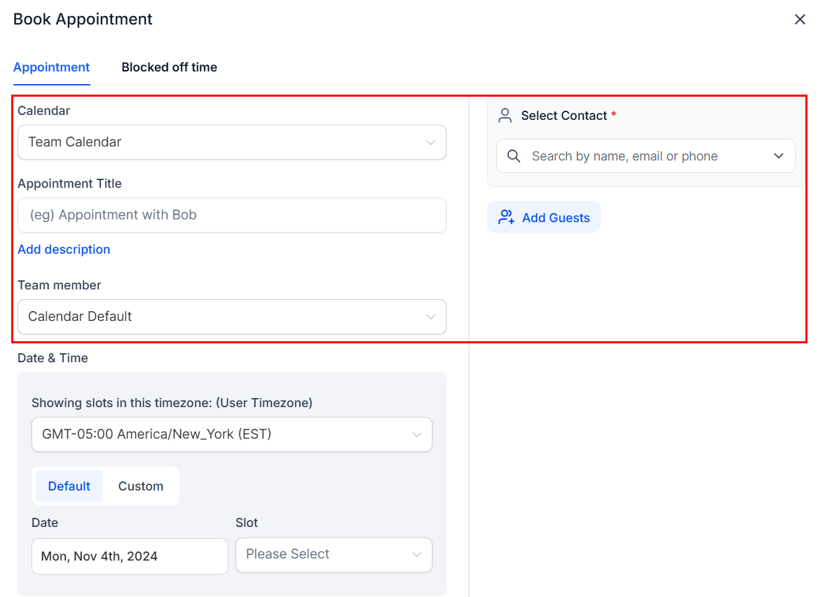 Next, choose the calendar on which the appointment will be scheduled, then enter a title and description. If applicable, select the assigned team member then choose the appropriate contact from the dropdown list.