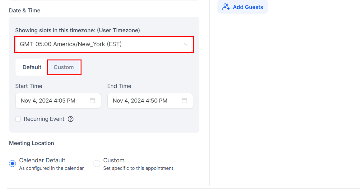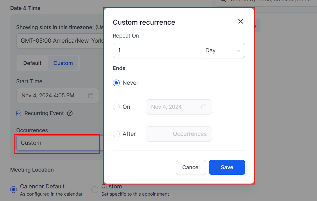 Within the platform's Calendars or Appointments tab, you can set up recurring appointments by manually selecting specific dates and times with the custom date and time options, even without configuring a recurring calendar. This approach allows you to create a series of scheduled sessions tailored to a client’s unique availability or requirements, bypassing the need for a preset recurring calendar configuration. Follow the guide below to learn how to create and edit a recurring appointment.