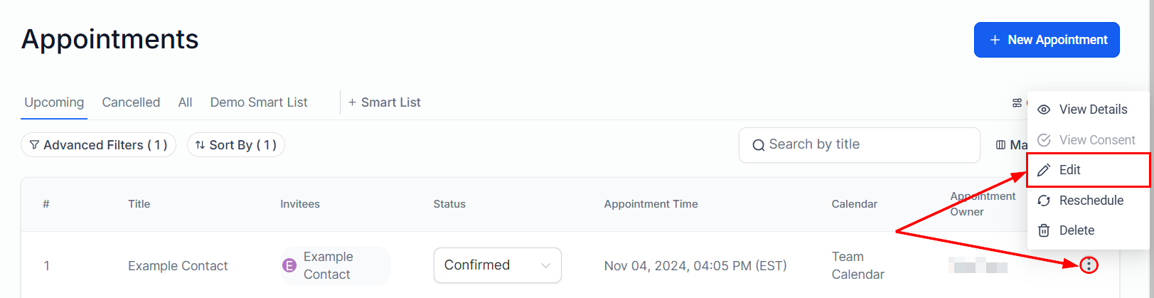 To modify the appointments, select the Edit option from the calendar actions dropdown.
