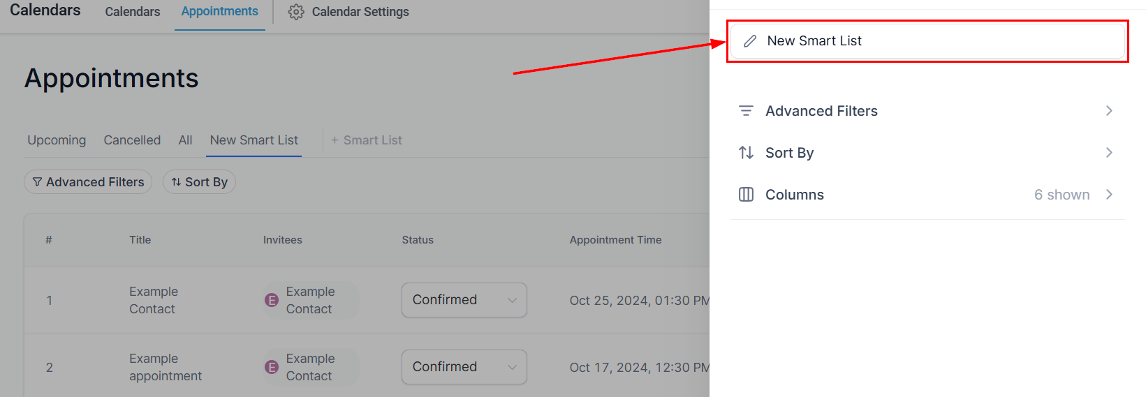 Select the Smart List option from the Appointments section in your account to start. This action will open a modal where you can enter the relevant details needed to create your Smart List.