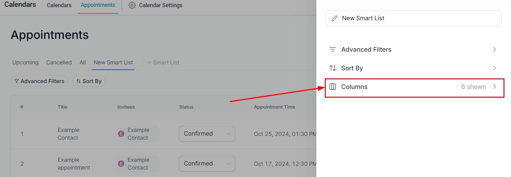 Customize the columns displayed in your appointment list and rearrange them according to your preferences within the Columns section.