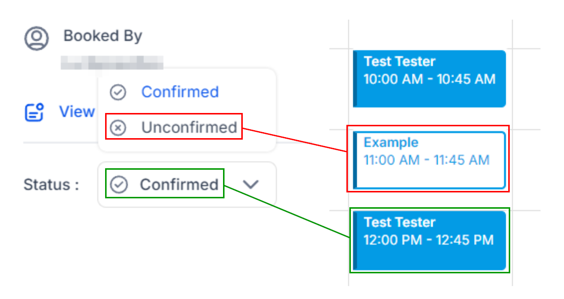 The appointment status can be updated using the Status dropdown menu. Any changes made here are immediately reflected in the appointment’s icon on the calendar. Unconfirmed appointments will appear uncolored, making it easy to distinguish them from confirmed bookings at a glance.