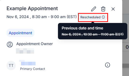 If the appointment was rescheduled, by you or the client, it will have a reschedule tag disclaiming it. Hovering over this tag will show you the original time and date of the appointment.