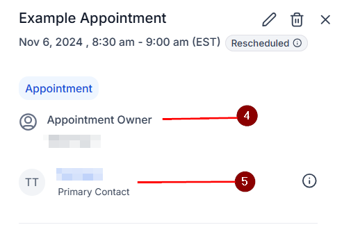 5. Underneath the appointment owner, you will see the contacts included in the appointment. If you have more than one, this will be a drop-down menu. Clicking on a contact's name will redirect you to their contact card.