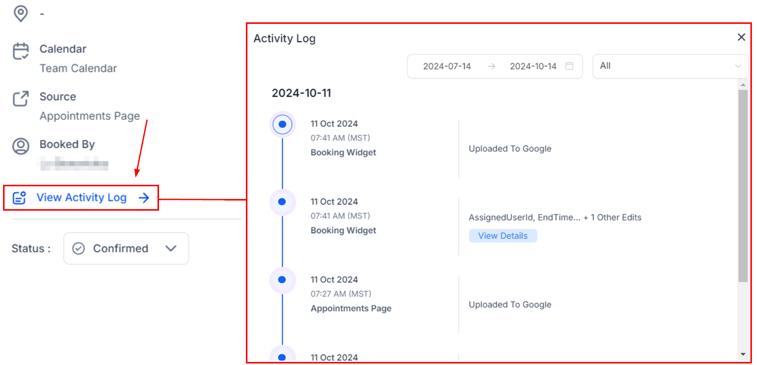 Click on View Activity Log for a detailed recap of all changes that have occurred with an appointment.