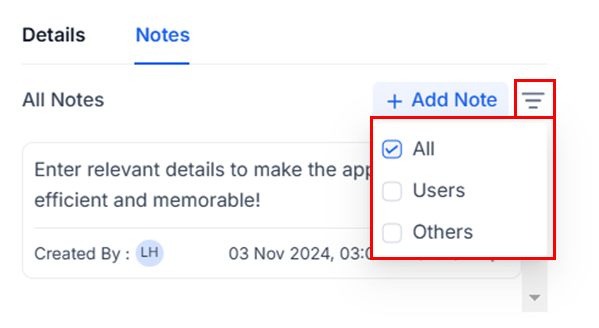 You can also filter notes based on the user who created them, allowing you to view only notes that you added or those created by other team members.