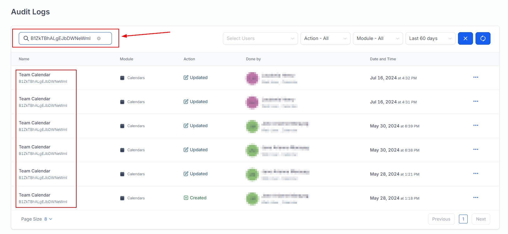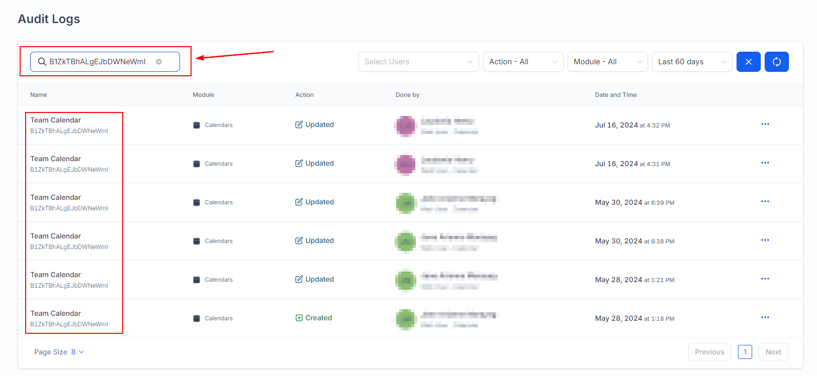 Once you have the Calendar ID you can enter it in the search bar, now the Audit Logs will be only for that calendar.