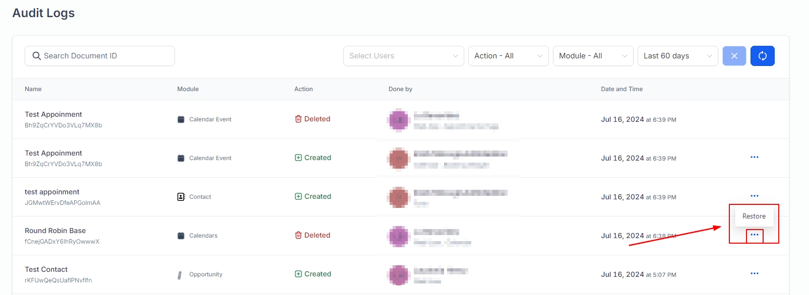 Have you ever deleted a Calendar by accident? There's nothing to worry about. Inside the Audit Logs, you can recover deleted calendars, along with their appointments, by clicking on the Three dot icon next to the log entry and selecting Restore.