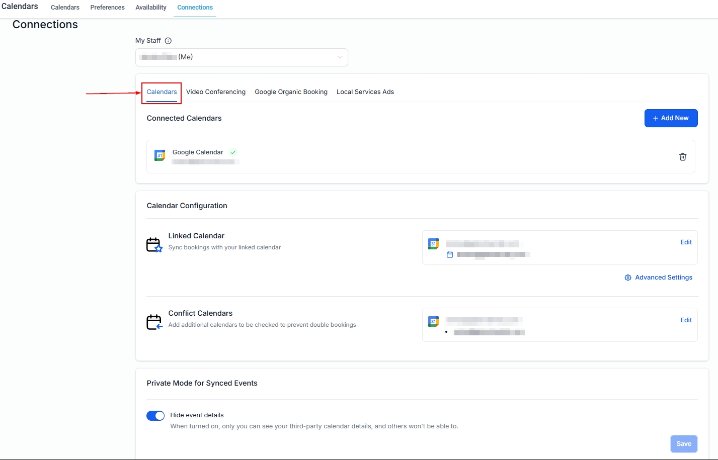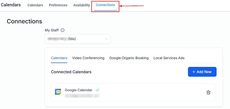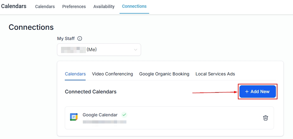 To connect your Google Calendar, Outlook Calendar, iCloud Calendar, or Calendly, click the + Add New button to set up the integration. You'll be redirected to a settings page where you can finalize the connection. If you already have one account connected, using this tab you can link up more.