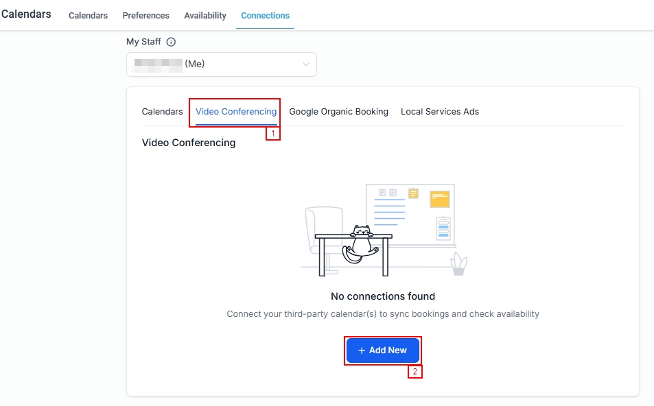 Here you can view and manage conferencing settings for your calendar. Clicking the +Add New buttons opens another page for you.
