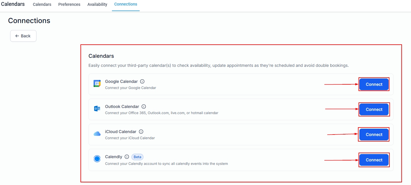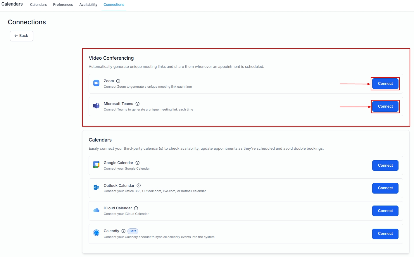 In the Calendars tab under Connections, you can manage integrations with Google, Outlook, iCloud, Calendly, Zoom, Microsoft Teams, and more. These connections streamline scheduling, sync external calendars, and help prevent double bookings.