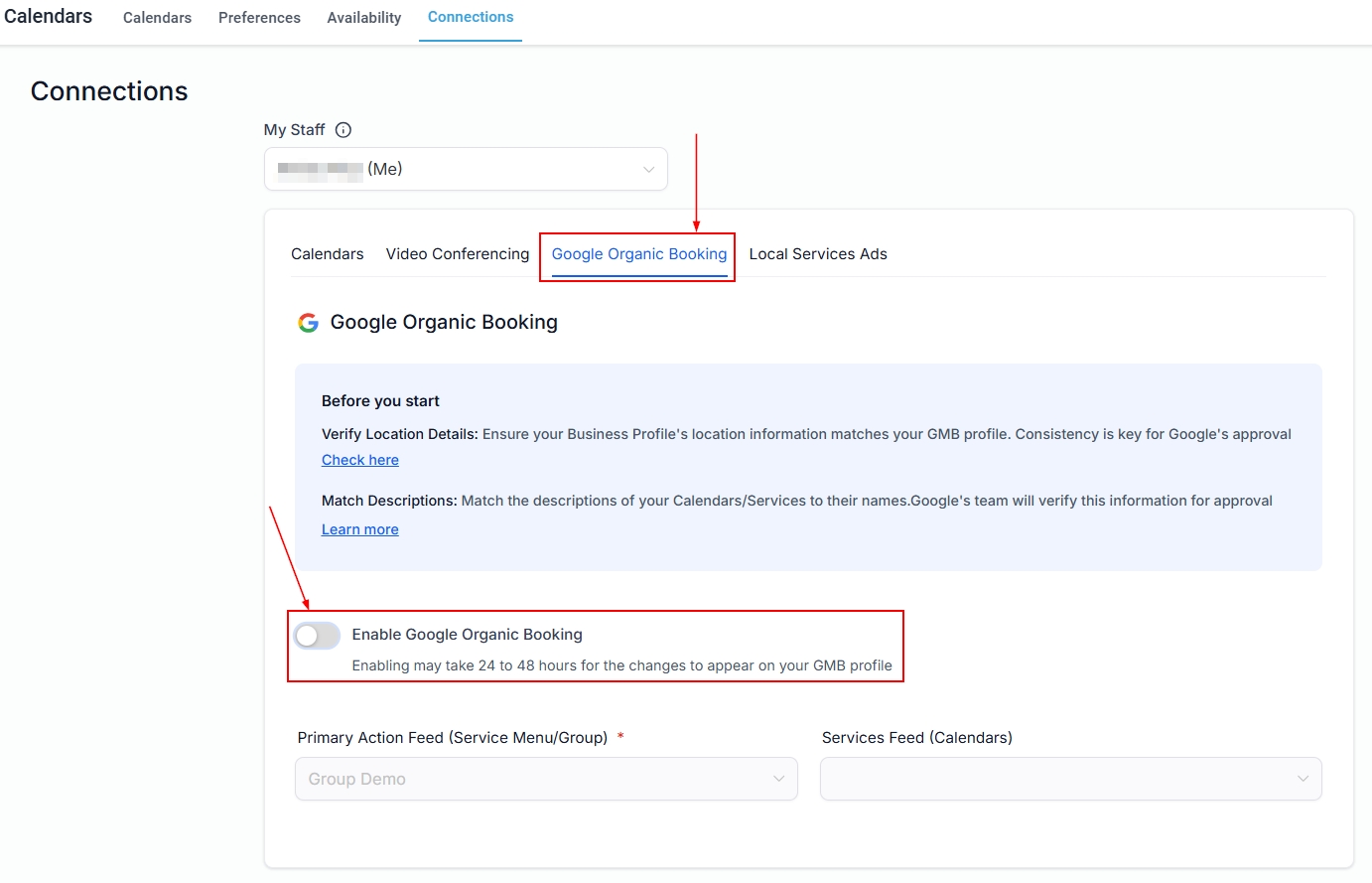 Toggle on to enable Google Organic Booking on your GMB profile.
