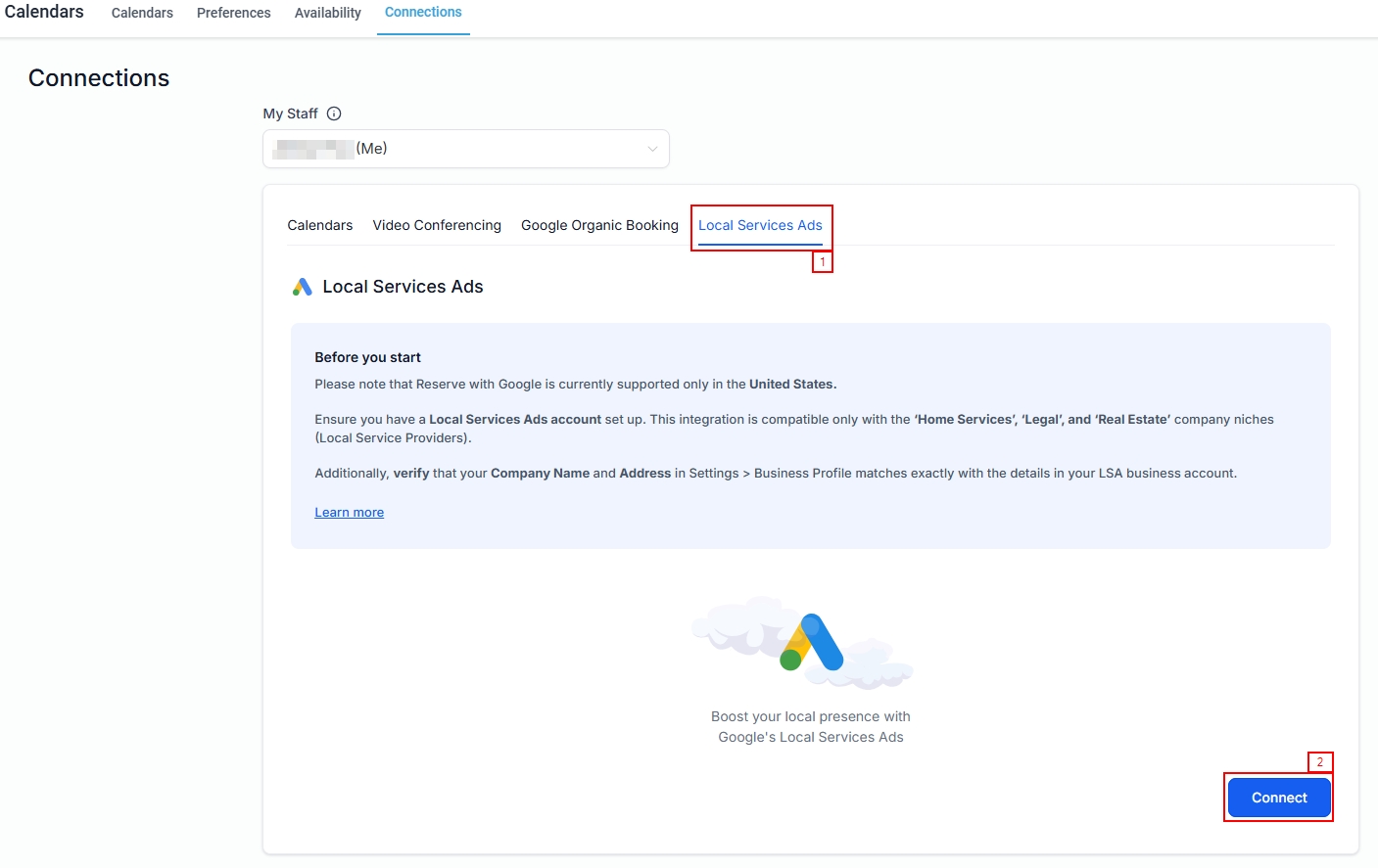 To connect your Local Service Ads account, click the connect tab to go to the integration menu to complete the necessary steps.