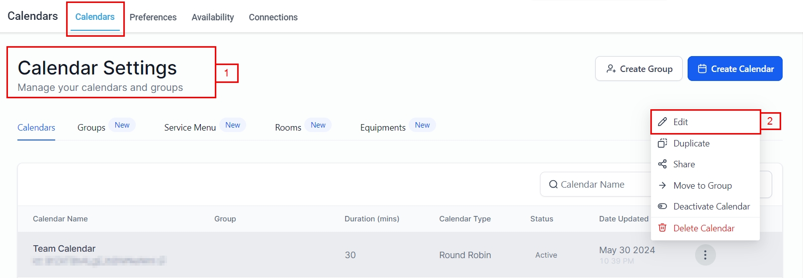 Go to the "Calendar Settings" section. Click the three dots next to the calendar you wish to modify, then select “Edit.”