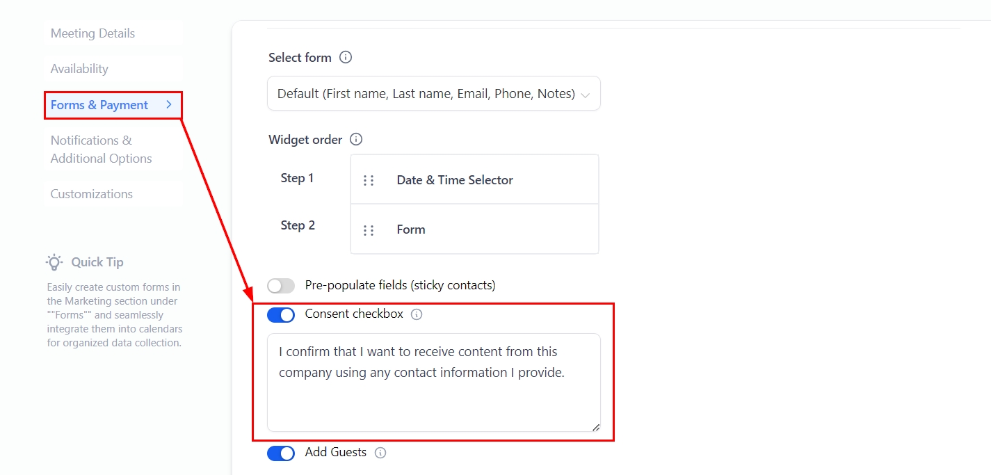 Navigate to the "Forms and Payments" area and locate the "Consent Checkbox" option. By default, this option is enabled for new calendars, but you can toggle it on or off as needed. If you wish to use a custom message, you can modify the default consent message to better suit your requirements.