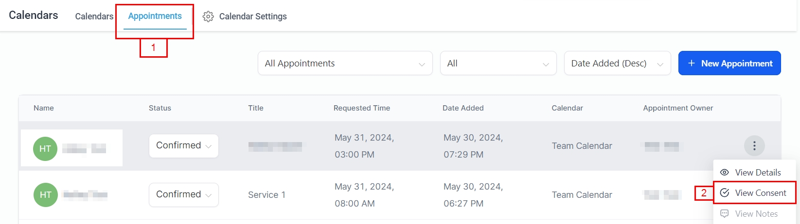 Return to the "Calendars" section and view the appointments list. Locate the appointment of interest and check for a consent verification option.