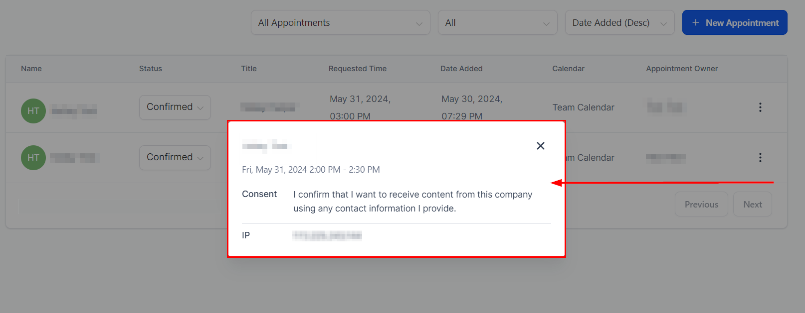 Once an appointment is booked with the consent checkbox feature enabled, you can verify the consent status directly within the CRM: