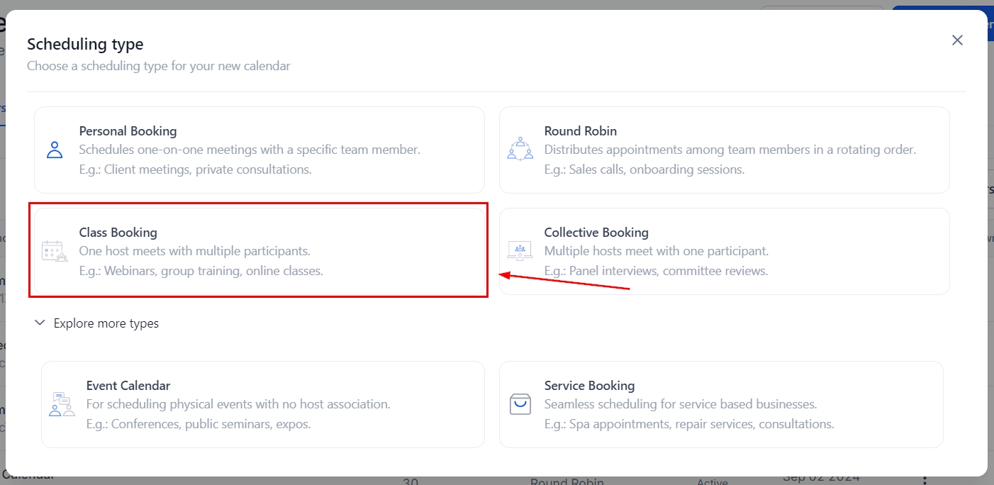 Class Calendars are designed to manage one-to-many events where multiple invitees can attend a single booking. These calendars are ideal for webinars, workshops, training sessions, and sports events. In a Class Calendar, there can only be one appointment owner, typically the trainer or host. The number of spots per slot can be set, with a maximum limit of 9,999 attendees, though meeting location limitations do apply.