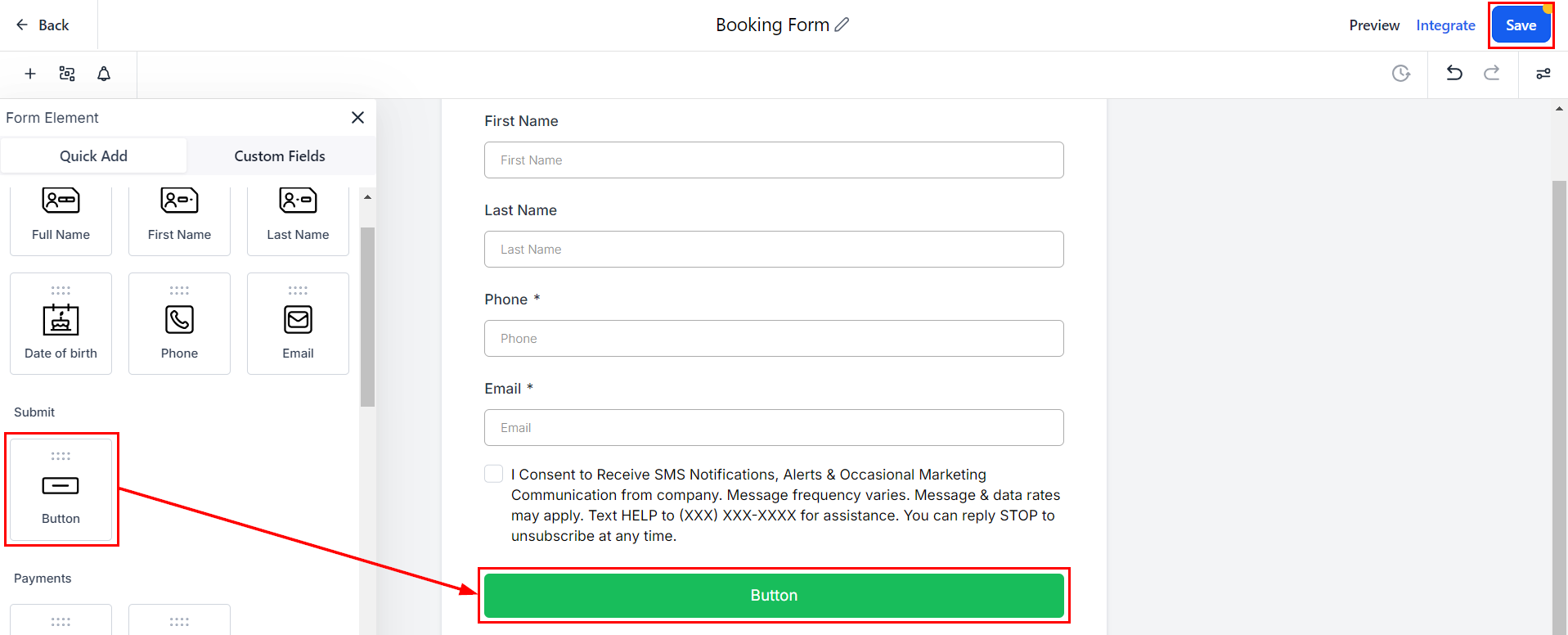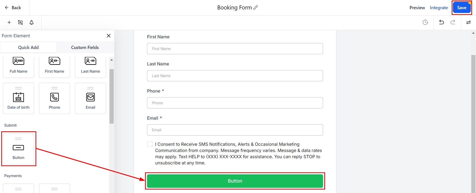 Add a submission button, such as "Submit," and customize its width as needed. Once complete, click 'Save' to maintain your progress.