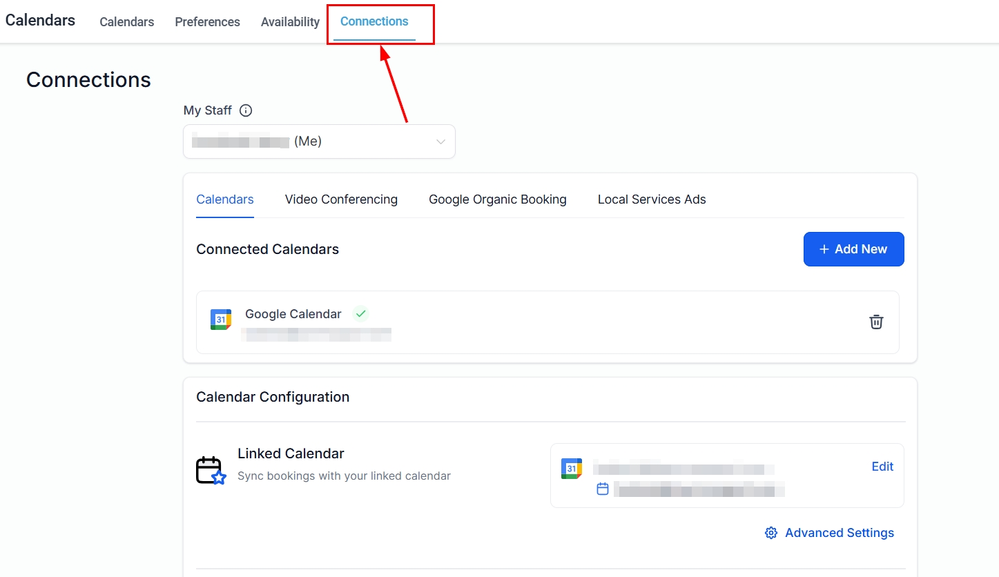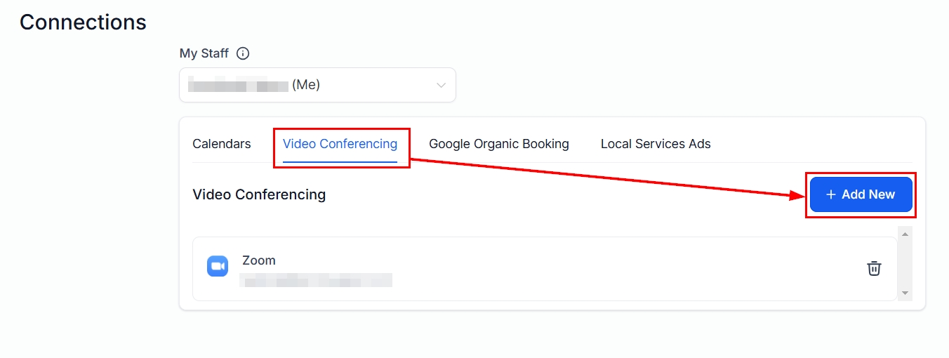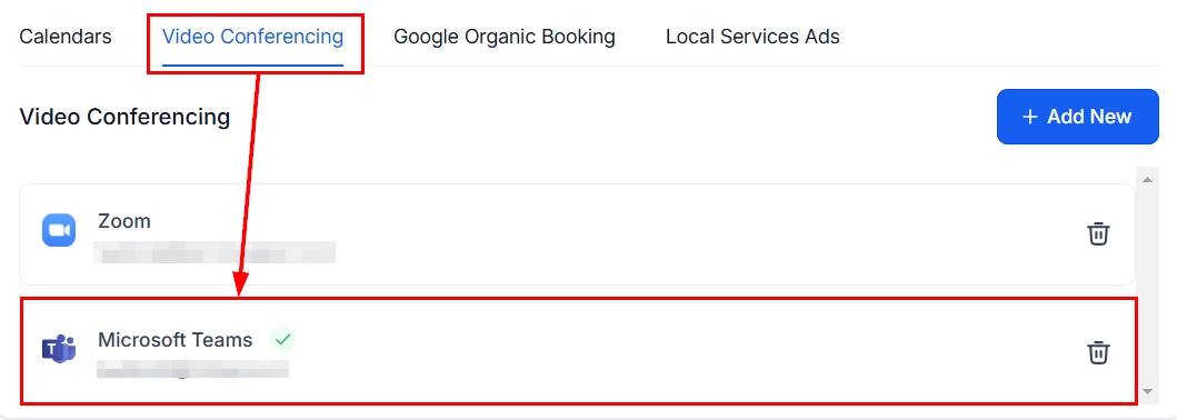 From here, go to the Video Conferencing tab then click Add New. This step allows you to integrate new meeting platforms, enhancing your scheduling capabilities.