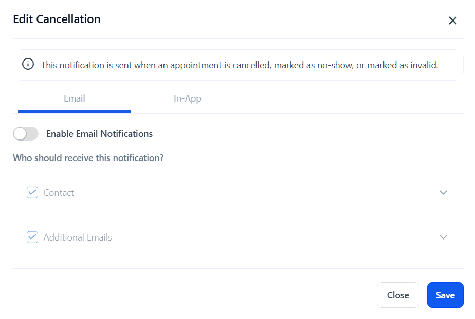 Efficiently managing notifications is essential for maintaining clear communication and ensuring smooth appointment scheduling. By fully customizing notification content and selecting specific recipients, you can deliver tailored messages to the right audience. Additionally, notification types extend beyond the standard confirmation email, offering options for Appointment Booked, Cancellation, Reschedule, Reminder, and Follow-Up notifications. Furthermore, notifications are delivered via both the web and mobile apps, offering the flexibility to send updates to assigned users or specific team members.