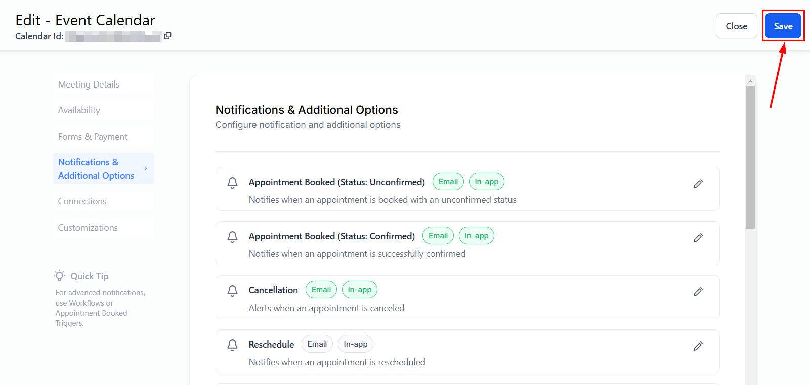 Proceed to customize the remaining notifications to suit your needs, then save the calendar to retain your changes.
