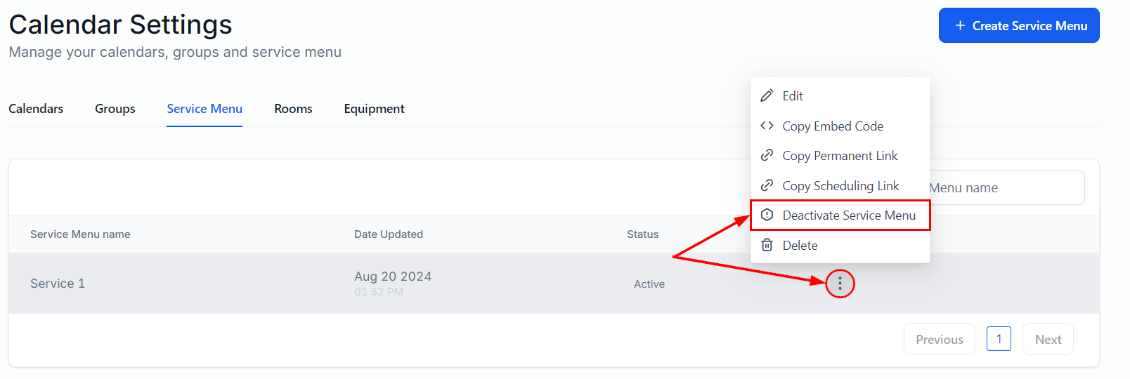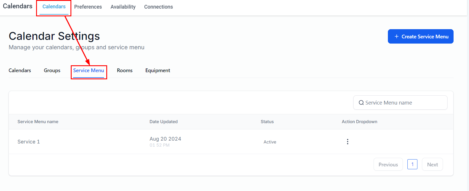 Start by accessing the Calendars Settings section within the CRM. This is where all your scheduled services and their settings are housed. Select the “Service Menu” tab to view the list of service menus you have created.