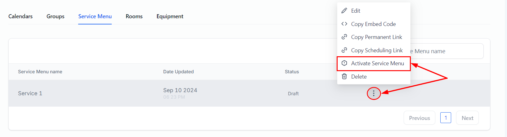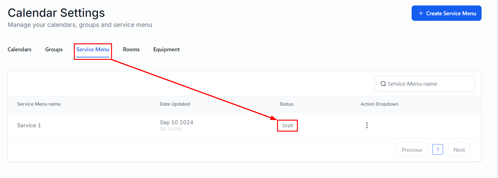 Identify the service you wish to disable. If the Status of the Service Menu is listed as “Draft,” it indicates that the service has already been disabled. Ensure that you select the appropriate service menu, as each one may have its own calendar setup.