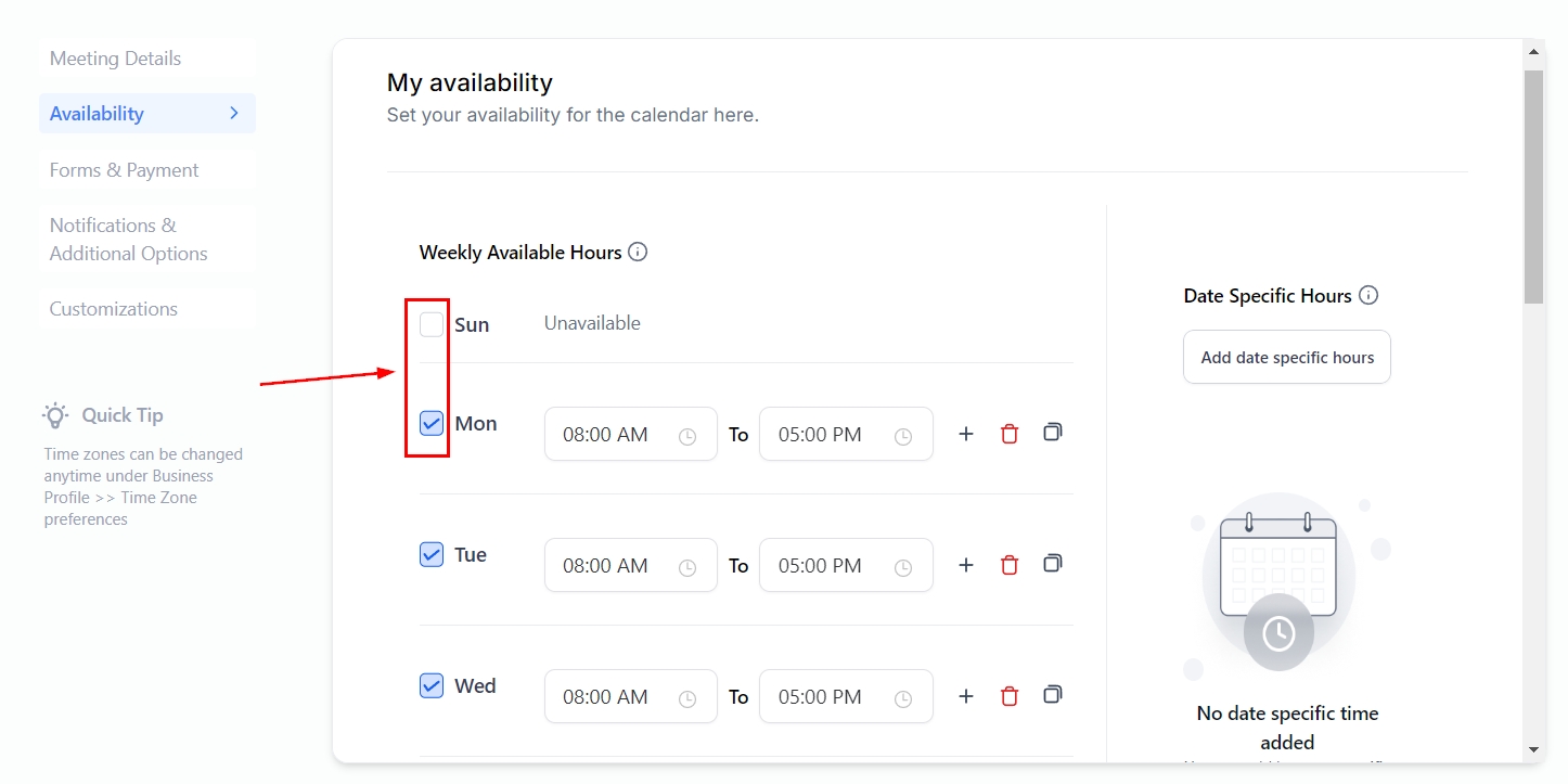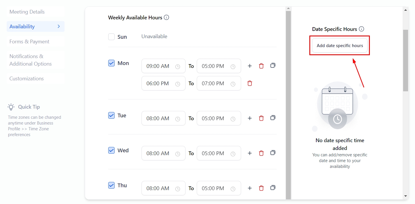 By setting Date Specific Hours you can override your regular weekly schedule for selected dates, to do so click Add Date Specific Hours.