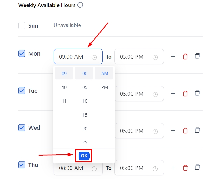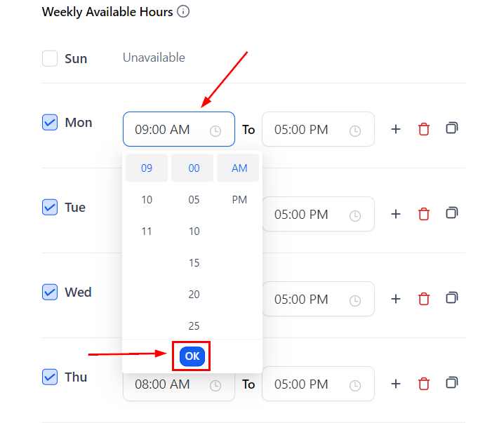 To change the available hours click on the starting or ending time, this allows you to select a new time from the scroll menu, and click Ok to set it.