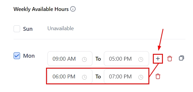 When you have a gap between the available time, click the + sign button to add the extra hours.