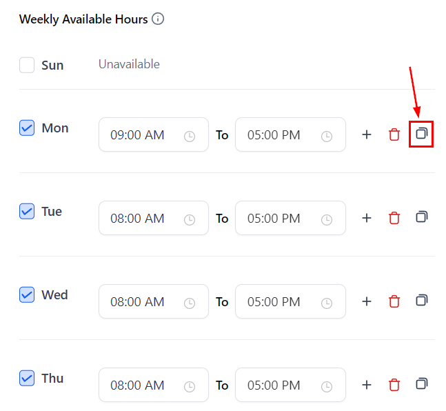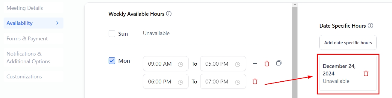 Click the date you need to customize then set your available hours or click the trash can icon to mark it as unavailable.