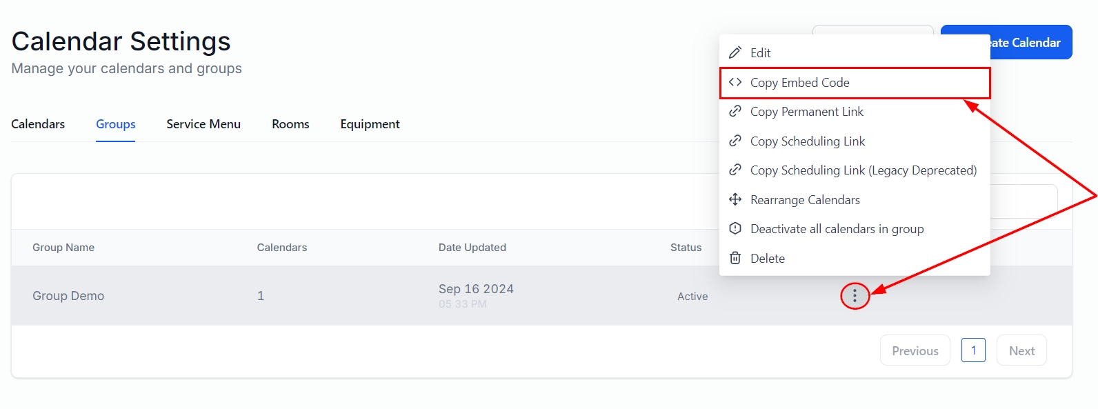Navigate to the Calendar Settings section of your account. You can choose to copy the code for either a single calendar or a group of calendars: