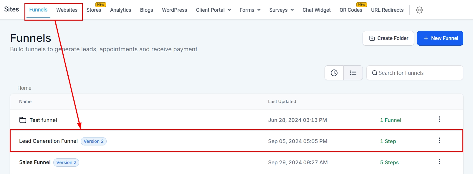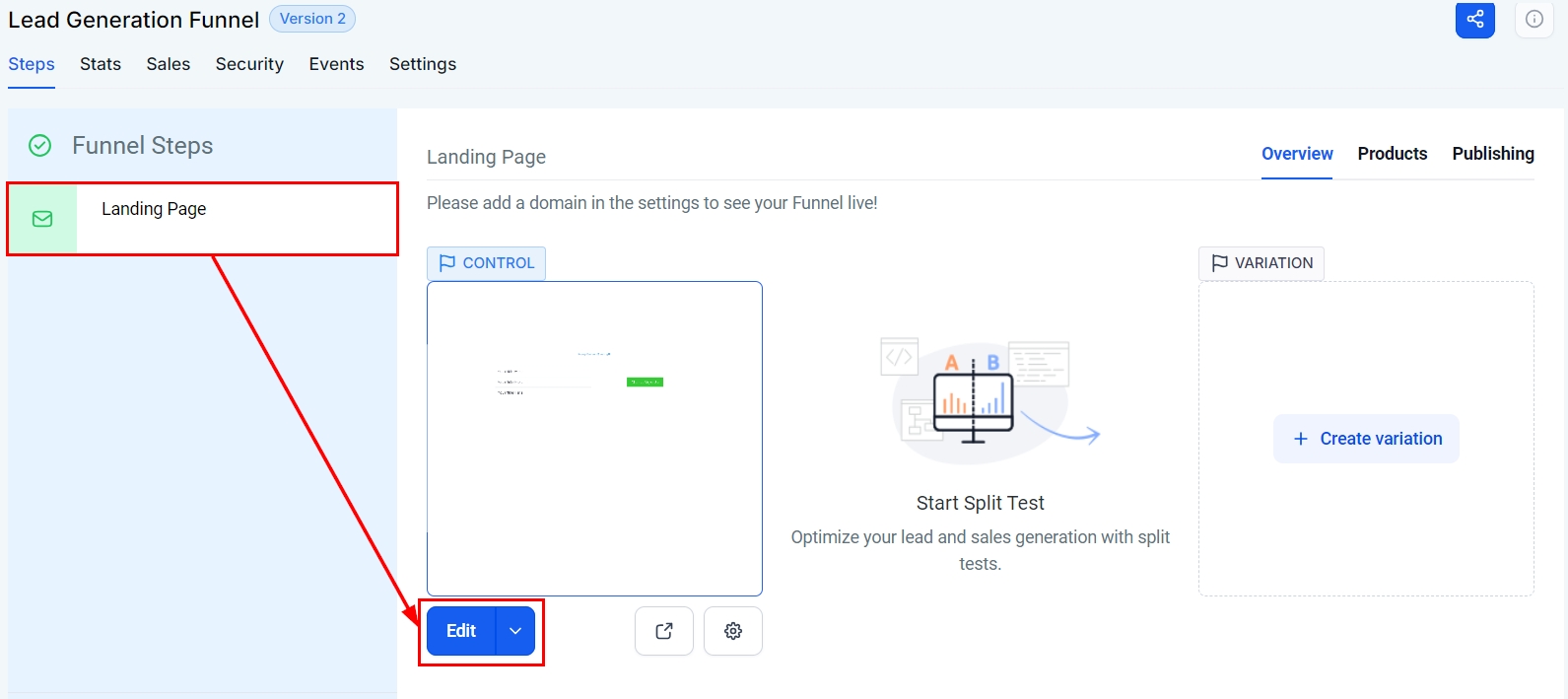 Select the desired funnel step or website page, then click Edit to open the builder.