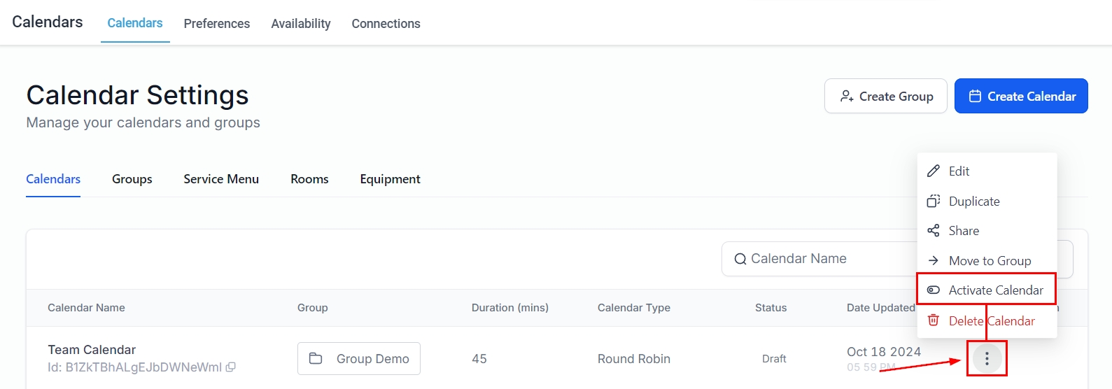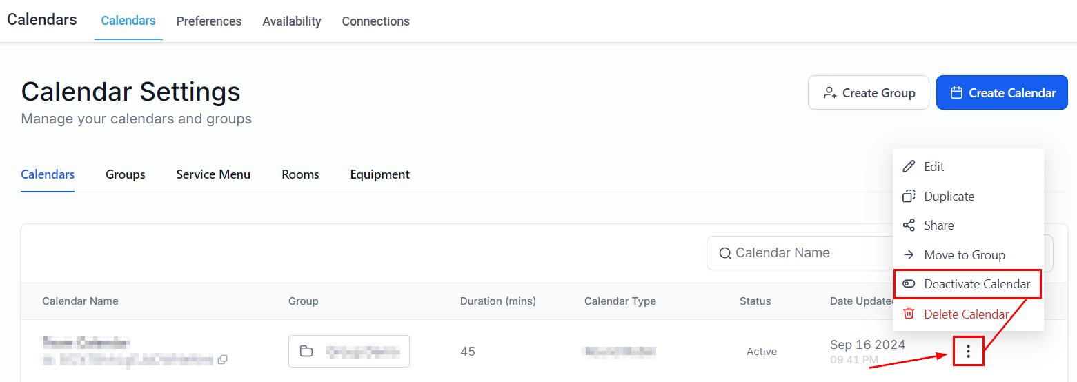 You can deactivate your calendar by selecting the 3-dot menu of the calendar and then clicking the Deactivate Calendar option to deactivate it.