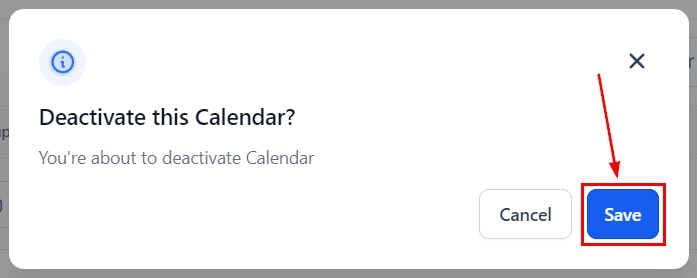 To activate the calendar click the three-dots icon next to it then select the activate option. Just like when deactivating, a confirmation window will pop up for you to click the Save button to confirm.