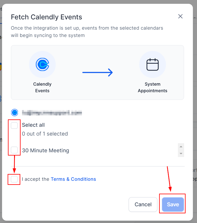 After connecting your account the system will need you to select the calendars you'd like to import the events from, accept the terms and conditions, and click Save to finish the set-up.
