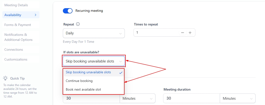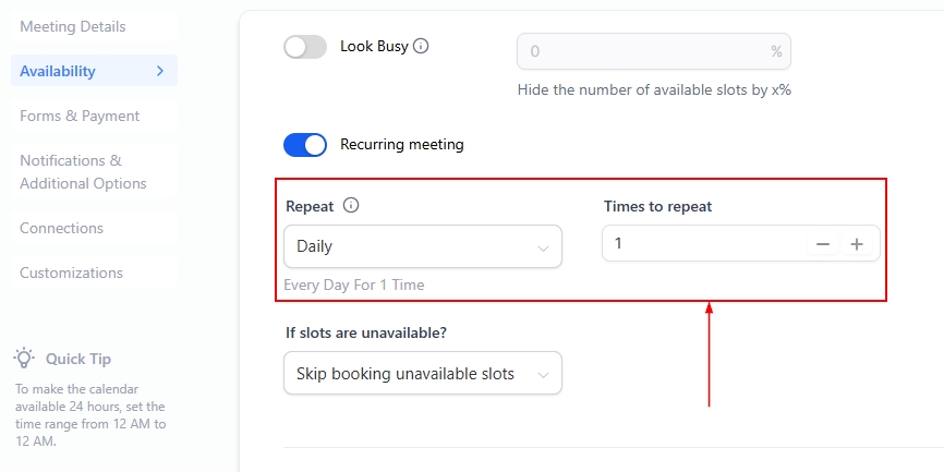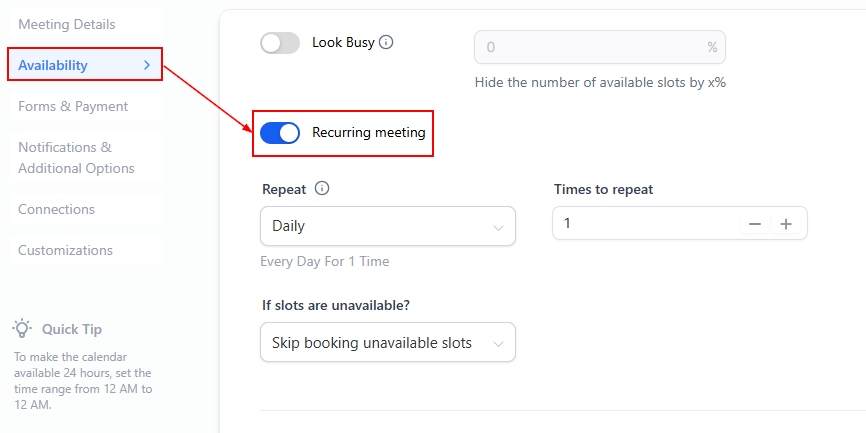 📌NOTE: This feature is unavailable for Service Calendars. To enable recurring meetings, ensure that only one team member is assigned to the calendar, and no date-specific hours are set.