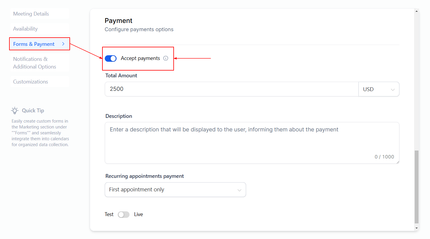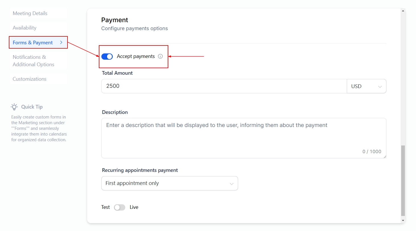 Within the Forms and Payment section of the calendar settings, you can configure payment options by toggling on “Accept payments”. This allows clients to make payments directly when booking their appointments.