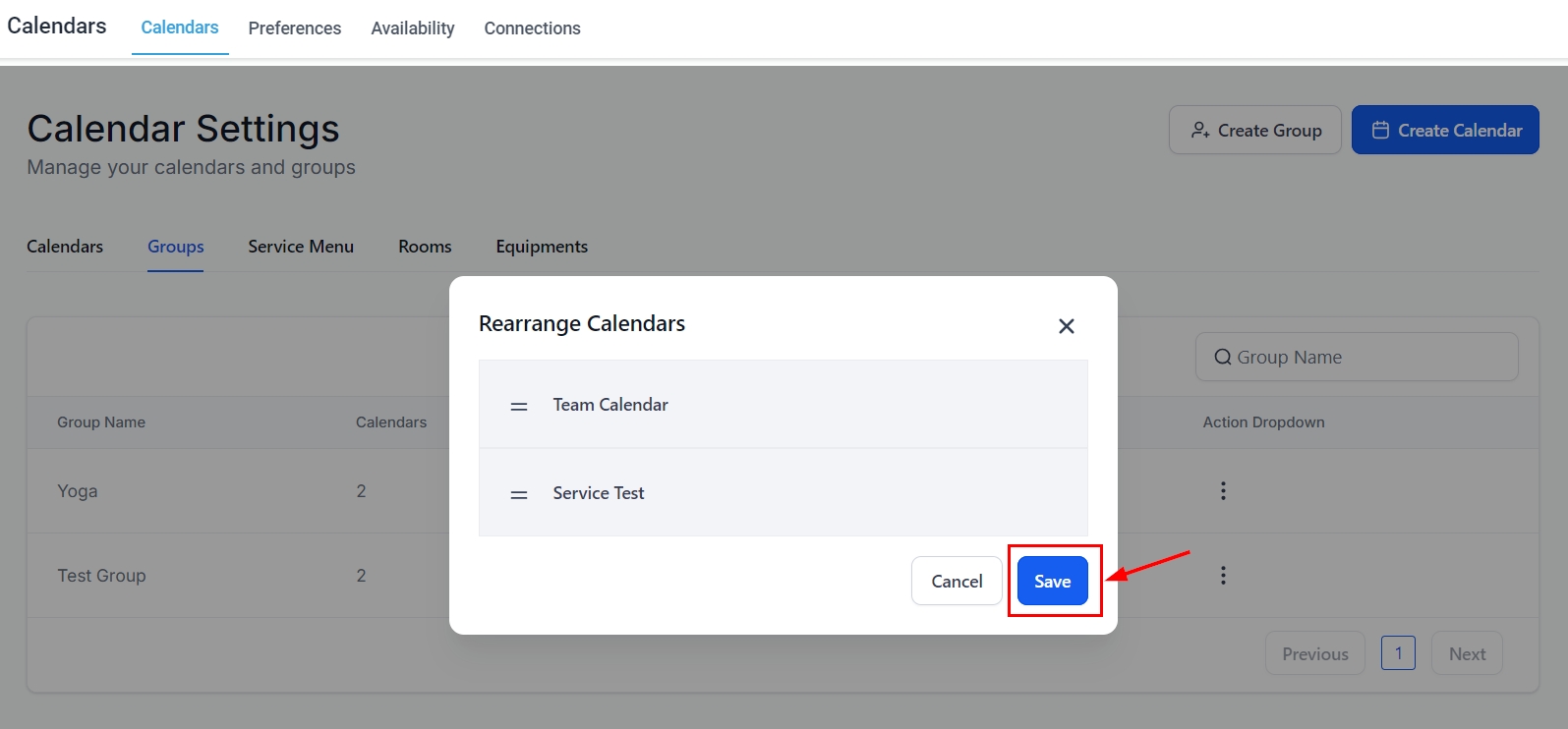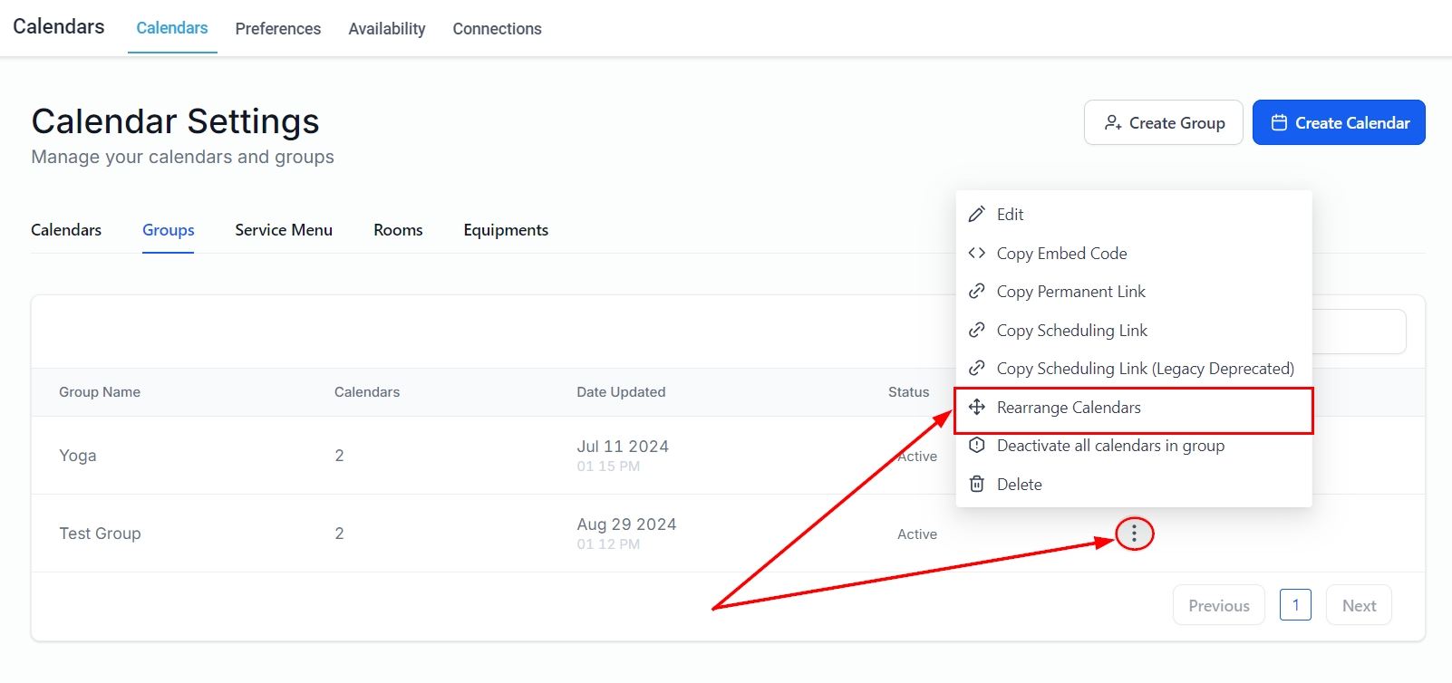 Within the Calendar Group section, you can reorder and rearrange calendars to customize the appearance of your service menu. This feature is particularly useful for highlighting priority services or organizing your calendars in a way that best suits your operational flow.